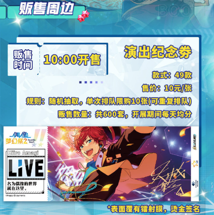 此外,展台现场将设置周边小卖部,制作人们可以购买限定演出纪念券,一共49款,表面均有烫金签名!制作人们赶快行动起来吧!