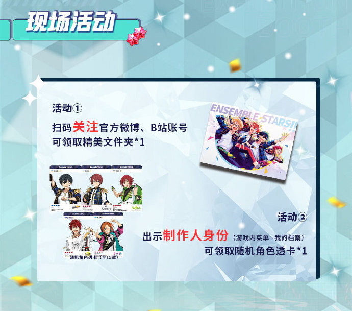 漫展期间,关注《偶像梦幻祭2》官方微博@偶像梦幻祭2、B站@偶像梦幻祭2助理君,即可获得定制文件夹*1。同时,现场点击游戏内菜单-我的档案,向工作人员出示制作人身份,即可获得随机角色透卡*1。期待各位制作人的踊跃参与!