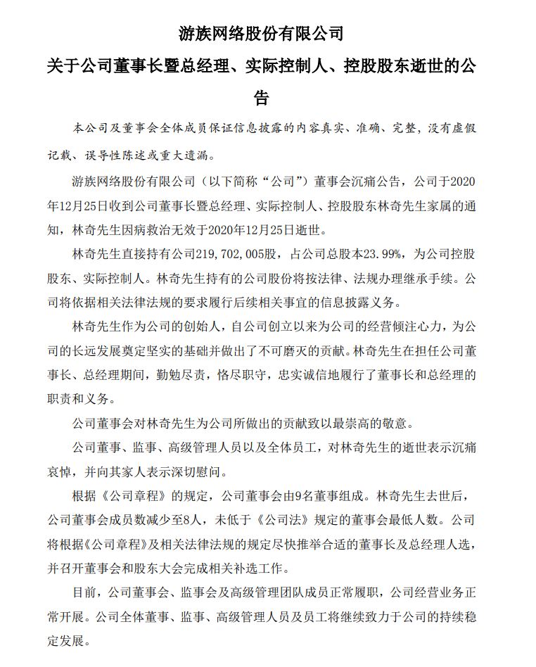 就在今日晚间,一直让大家心里悬着的林奇被下毒事件终于传来了新消息,但没想到这个消息却让所有人都承受不起。游族正式发布了公告,林奇因病救治无效于2020年12月25日逝世。