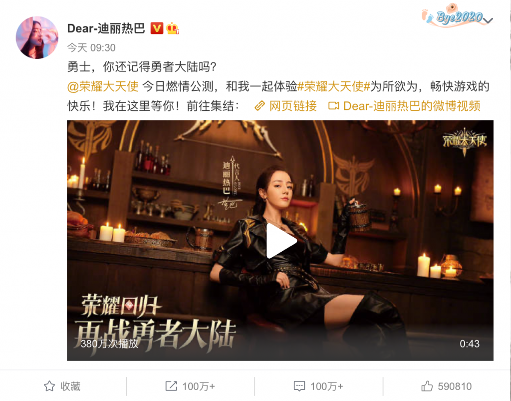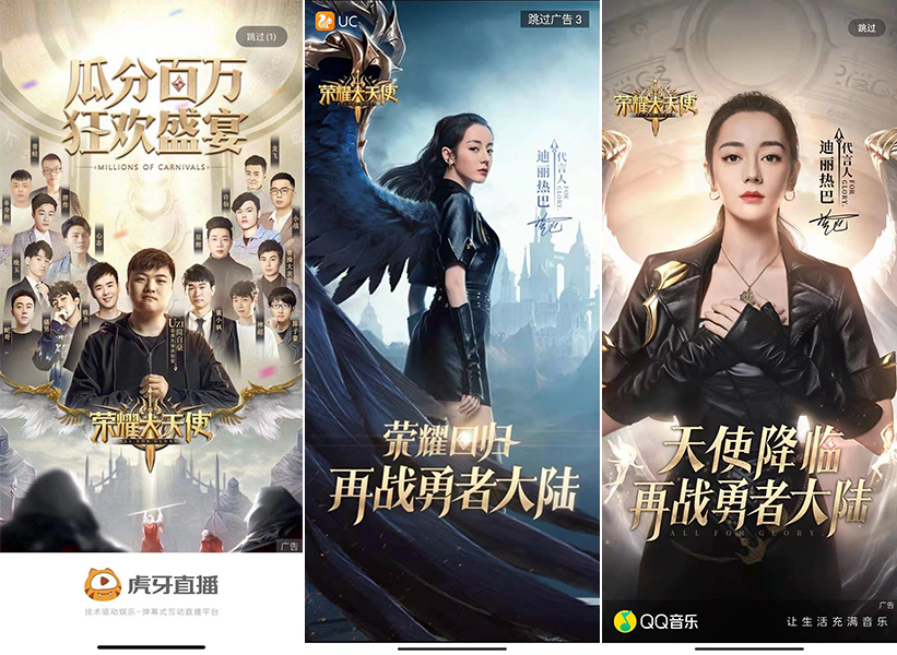 在线上部分,三七这次仍然选择了颇为常见而且吸量效果比较稳定的代言人攻势:本次《荣耀大天使》邀请了迪丽热巴、孙红雷以及Uzi出任游戏的代言人,并且在预热和投放阶段也有都有多个电影级的广告片输出。