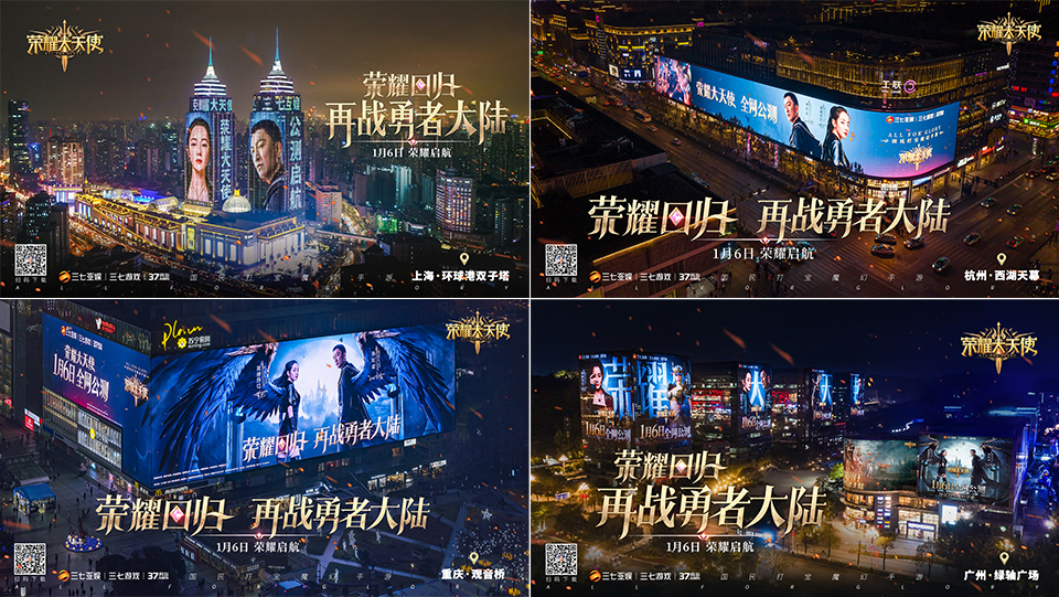 在线下环节,这次三七也十分大手笔地选择了4个城市进行了地标广告投放。在1月6日游戏首发当天,《荣耀大天使》的巨幅广告登上了上海双子塔、杭州西湖天幕、重庆观音桥天幕、广州猎德大桥、广州黄埔科学城绿轴广场。