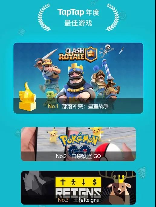 2016年的年度最佳游戏是《皇室战争》《口袋妖怪GO》和《王权Reigns》,皆为国外游戏