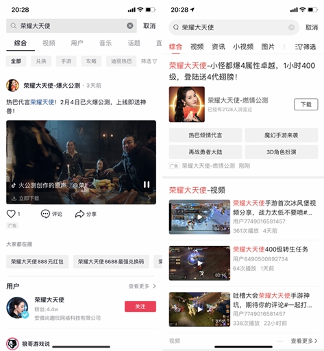 其次是更精细化的流量运作。与传统的单一链路搜索投放相比,《荣耀大天使》这次的线上广告投放借助了今日头条+抖音搜索联动信息流,在巨量引擎体系内构建了内容场景下的完整链路。
