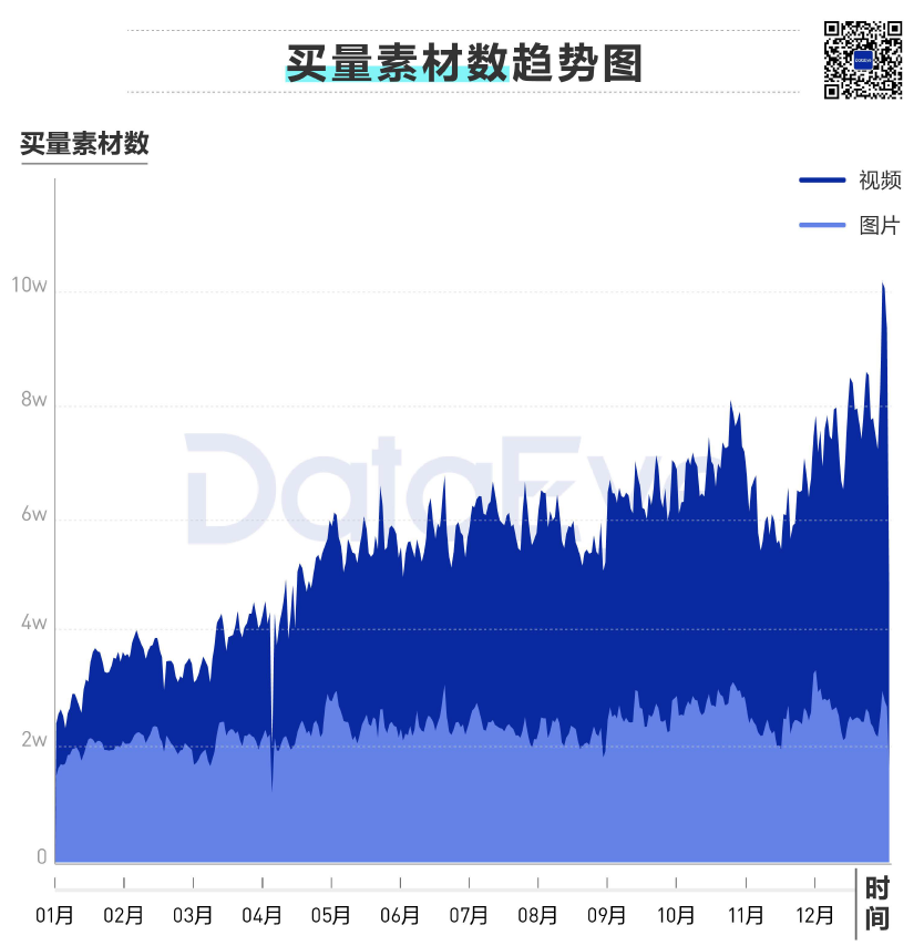 比如买量这块,据DataEye-ADX的报告,去年买量市场总体量依然在稳步上升,单日投放素材量更是在年底突破10万素材里程碑,素材投放量同比涨幅96.55%。