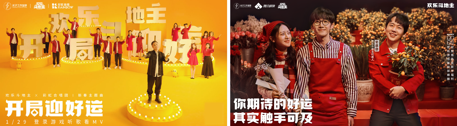 先是与彩虹合唱团牵手合作的一首新春神曲《开局迎好运》带起欢乐节奏,随后又携才子郭麒麟演绎春节品牌片为开年好运定调,串联起“欢乐+好运”成双对的新年美好期盼,也生动呈现出腾讯棋牌在牛年春节想要传递给玩家们的新春主题。