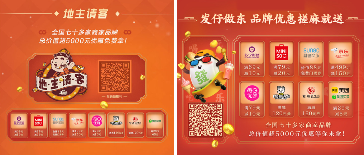 除了以上“独宠一人”的超级福利,腾讯棋牌还准备了“雨露均沾”的多重线下好礼。与玩家社区“游戏人生”展开欢乐联动,地主哥请客,发仔做东,衣食住行全给你“管上”!全国70多家商户品牌,总价值超5000元的优惠福利一股脑儿全给你打包好了,牌友、麻友们只需要凭棋牌玩家身份或战绩就能在游戏里或者商家小程序中领取到~