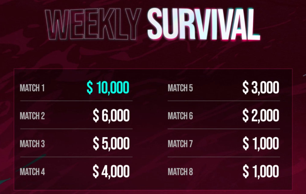 每周16场周中生存赛中,前8场比赛的吃鸡队伍将获得不等额依次递减的奖金,而后8场比赛的吃鸡队伍不会获得额外奖金,但依旧能够获得直通本周周末决赛的名额。