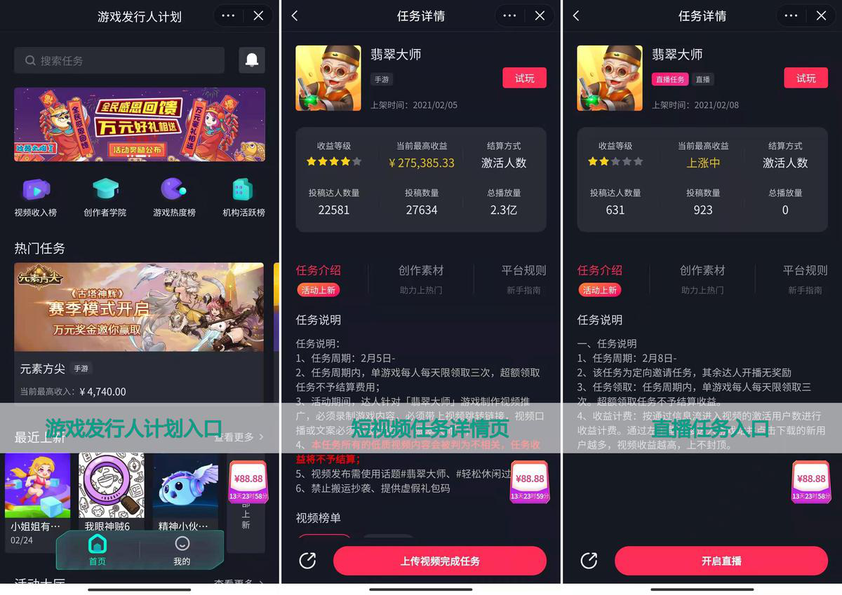 此外,“游戏发行人计划”也不会像传统投放打法一样,需要厂商逐一与具体的UP主或者KOL洽谈合作,而是把投放需求像“悬赏”一样挂在加入平台的抖音创作者眼前,并且根据作品的最终传播效果,给予创作者不同的奖励。