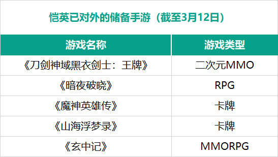 “研发、发行、投资+IP”的三核驱动,让恺英的产品储备在短时间内丰富了起来。据手游那点事统计,恺英的产品储备超过6款,涵盖了卡牌、MMORPG以及二次元这几个赛道。