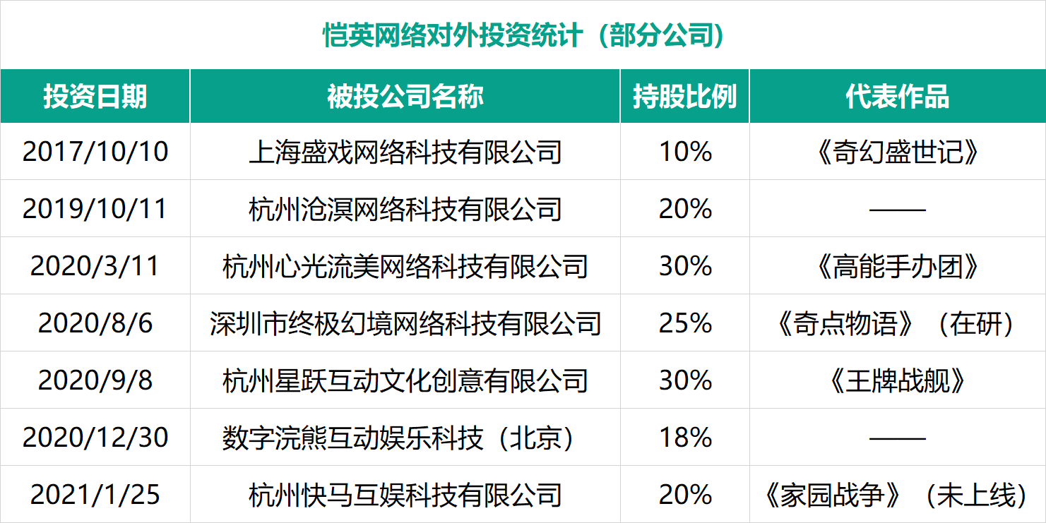 除了自研之外,恺英通过投资游戏公司以补充自研短板的“野心”也颇为明显。