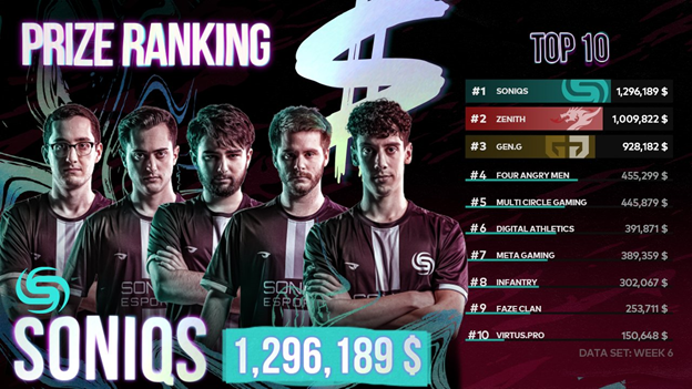 本次PGI.S最终大奖获得者,是来自北美赛区的强队Soniqs。在为期六周的比赛中,SQ共有四周成功晋级周决赛,虽然在本周开赛之前,他们仅仅位于排行榜第15名。SQ战队有着欧美队伍都较为擅长的刚枪能力,在赛事运营方面,他们过去的表现却似乎总是棋差一招。而谁也没有预料到,这支在前五周“韬光养晦”的队伍会在第六周的赛场上大放异彩。