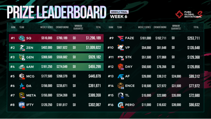 【Krafton Inc.旗下PUBG工作室】群英荟聚,奇迹再启!为期八周的PGI.S全球邀请赛(PUBG GLOBAL INVITATIONAL.S,以下简称“PGI.S”)于3月28日晚落下帷幕,得益于PGI.S的Pick'Em Challenge活动,最终比赛的总奖金池达到了7,056,789美元,也让本届PGI.S成为PUBG电竞历史上奖金最高的赛事。第六周周冠军是来自北美赛区的SQ战队,“Winner Takes All”,因此他们获得了129万美金奖金,同时也一举成为PGI.S赛事的总冠军。来自PCL赛区的4AM、MCG和iFTY战队则分别在总奖金榜上位于第四、第五和第八位。