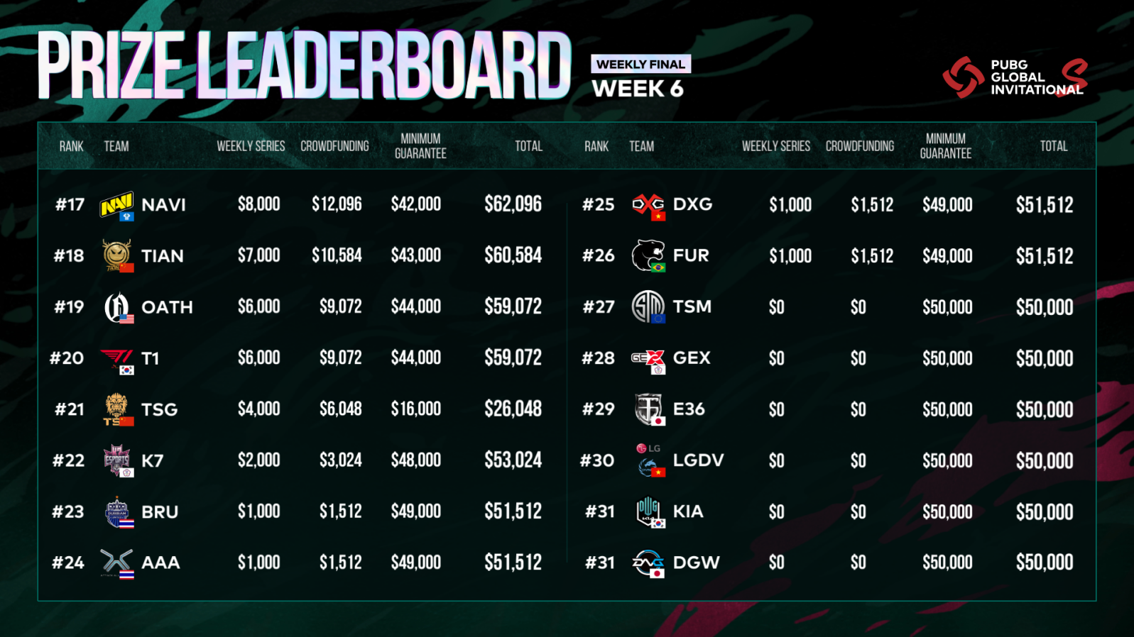 比较遗憾的是本周Tianba战队虽然成功进入周决赛,但是关键时刻未能很好地把握住机会,最终他们以60,584美金的奖金结束了自己在PGI.S的旅途。PeRo和TSG则分别获得了66,632美金和26,048美金。