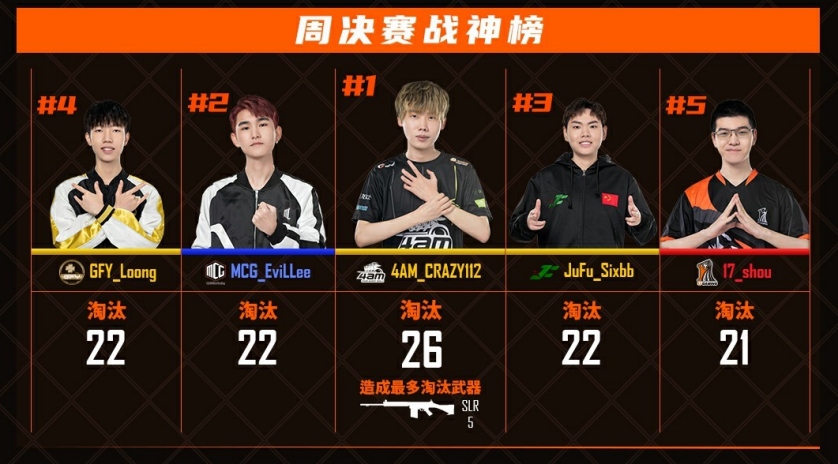 在2021春季赛的首周常规赛中,CRAZY112将自己的完美状态维持了一整周,从周中赛33淘汰,再到周决赛26淘汰稳居第一,周战神之位实至名归。而在一骑绝尘之后,MCG_EviLLee与JuFu_Sixbb以及GFY_Loong三人以同样的22淘汰分列淘汰榜二、三、四名。当然,这只是常规赛第一周的战斗,最后如何犹未可知,是CRAZY112莽到最后,亦或黑马出世完成登顶,拭目以待!