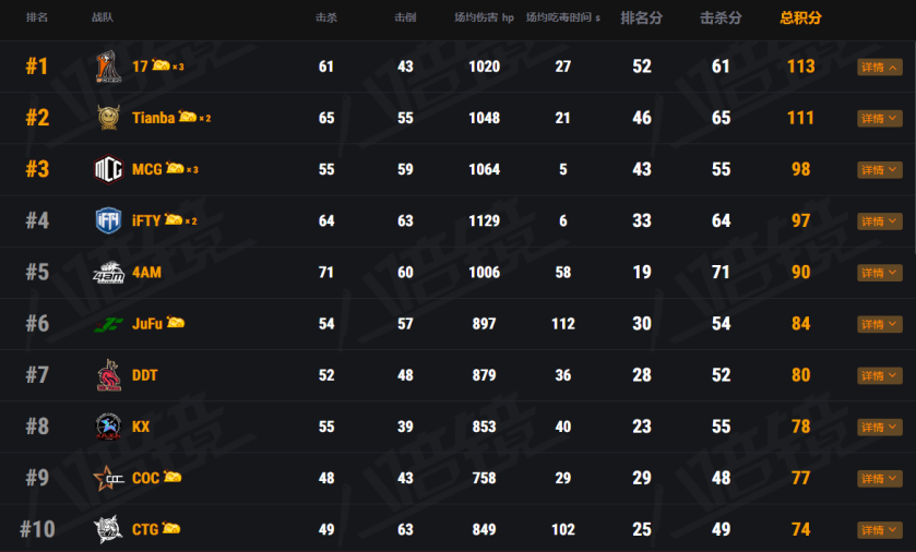 在2021PCL春季赛常规赛首周赛程已经结束,在第一周周中赛中,以全新姿态回归PCL的17战队展现了新阵容的一流统治力,在参加周中赛两日的十六场比赛中斩获三鸡,以113的总分首位进入周决赛;而刚从PGI.S全球邀请赛归来的Tianba战队,状态丝毫不减,周中赛紧咬17战队以111的总积分进入到了周决赛;而后MCG、iFTY、4AM三支战队同样不甘示弱,分别以98、97、90的总积分跻身周中赛三、四、五名晋级到周决赛。