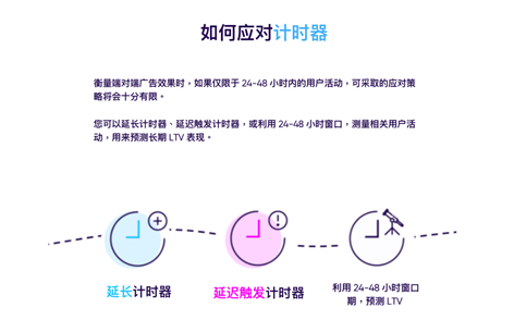 SKAdNetwork 计时器运作原理及应对方案:AppsFlyer 在《指南》中详细解读了计时器运作方式,带来的挑战和局限性。并且深入分析延长计时器,延迟触发计时器,利用 24-48 小时窗口期预测 LTV 三种应对方式的原理及利弊。