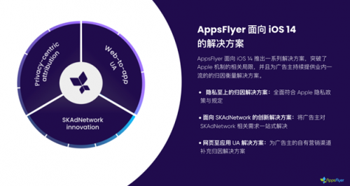 《指南》还详尽公开了 AppsFlyer 针对 iOS 14 的核心解决方案,包括:隐私至上的归因解决方案;面向 SKAdNetwork 的一站式解决方案 SK360;网页至应用 UA 解决方案;再营销应对方案等,帮助广告主解决数据访问和数据衡量受限的不确定性,结合多种解决方案实现最大程度数据覆盖,为广告主赋能的同时保护终端用户隐私。