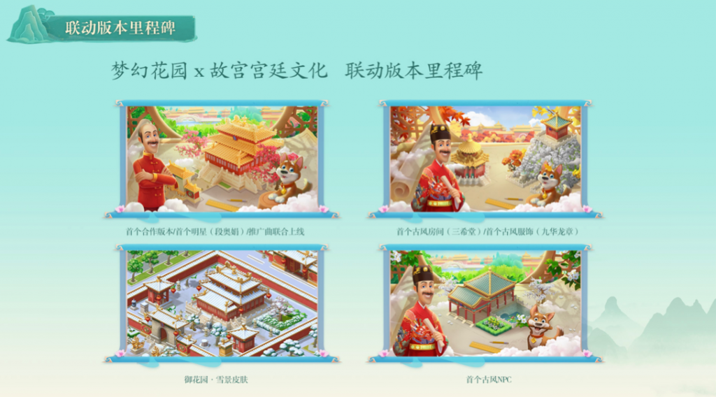 除了有趣的游园活动,这次的《梦幻花园》的策划也来到了现场与玩家们分享联动版本以及《梦幻花园》x故宫宫廷文化联动可以说是《梦幻花园》联动版本的里程碑,不仅是游戏的首个合作版本,也同时推出了首支明星联动版本主题曲、首个定制房间三希堂以及专属汉家服饰九华龙章,而在游戏皮肤方面,不仅开放了御花园全区域,还推出了首个御花园雪景皮肤。