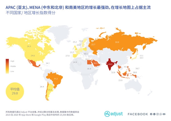 Adjust 通过自创的增长指数得分 (Growth Score) 绘制了一份全球应用增长地图,将视线投向规模和发展都相对成熟的市场之外,洞察移动应用趋势,为应用营销人员指明最具增长潜力的地区。