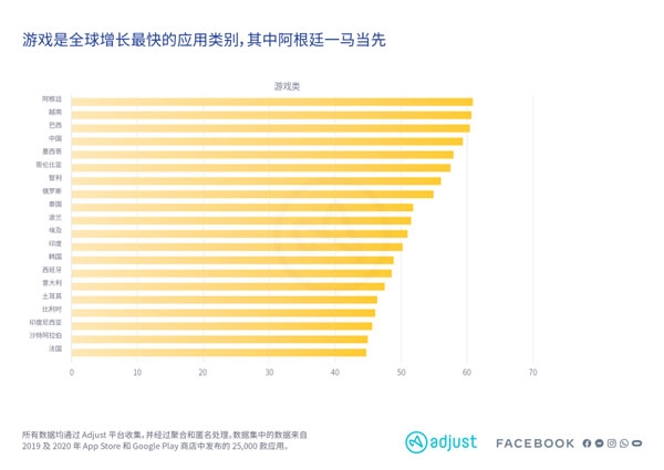 拉丁美洲成为游戏应用增长引擎。该地区移动设备普及率提高,城市人口也在不断增长,进而推动了移动端高速发展。游戏类应用增长排名前五的国家或地区中,有三个来自拉丁美洲,其中阿根廷遥遥领先,越南、巴西、中国和墨西哥紧随其后。