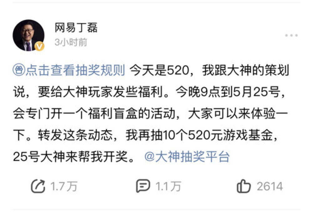 丁磊空降网易大神,520豪送52000份福利宠爱玩家