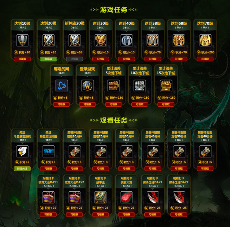 如果您是一个魔兽玩家,每日登录游戏,提升角色等级,畅玩全新种族,都可以获得海量积分;如果您是一个斗鱼水友,每天完成观看任务,打卡精彩节目,关注暴雪游戏频道,也可以获得海量积分!具体任务及奖励积分如下图所示: