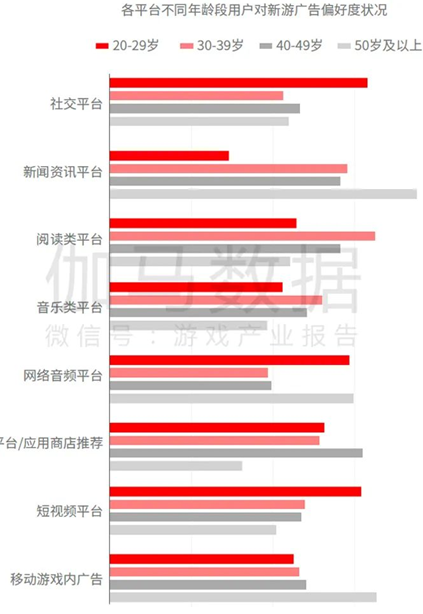备注:“偏好度”仅证明各平台不同年龄段用户对新游广告的偏好状况,不能用做渠道间横向对比,这一数据通过用户调研深度处理后获得。
