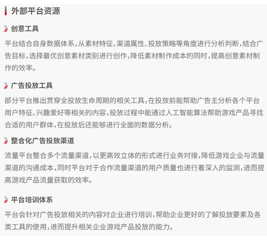 人才是游戏企业用户增长的重要挑战,但这一领域短期内或难以弥补,人才的培养与补给需要行业长时间的沉淀。但在流量获取层面,游戏企业还有更多可运用的外部资源,例如可借助于外部平台资源提升流量获取的能力,进而保障产品的用户增长。现阶段针对于游戏企业的流量获取服务体系已较为完善,相关平台能围绕自身创意工具、广告投放工具、整合化广告投放渠道等帮助游戏产品更好吸引用户,进而弥补游戏企业因专业人才缺乏而面临的流量获取困境。