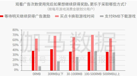 据伽马数据的调研结果显示,在广告次数使用完后,多数用户会选择做更多任务或等待明天继续获得广告激励,倾向于继续以免费的方式获得奖励,但也有部分用户选择小额付费获得,消费习惯越成熟的用户付费意愿越强,这也说明广告对于用户付费或有助推作用。在中重度游戏的实际变现案例中,也有多个产品进行了印证,游戏产品在引入广告变现后不仅提升了整体收入,对于现有用户的付费也形成了一定的推动。