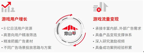 穿山甲基于平台成熟的技术实力与多元的资源链接能力,能够为游戏开发者提供全生命周期的产品解决方案。在游戏用户增长上,穿山甲依托于用户资源、用户筛选机制、广告场景积累与创新,用产品提供针对性的解决思路与方案,相关服务体系贯产品全生命周期。在流量变现上,穿山甲以广告变现为基础,依托于丰富的广告需求、产品变现支撑体系、激励视频等方面驱动力帮助中重度游戏产品深入挖掘用户潜力。穿山甲为游戏产品提供涵盖用户增长与流量变现的一站式成长服务体系,进而帮助企业优化商业化策略,解决产品用户层面相关的痛点。