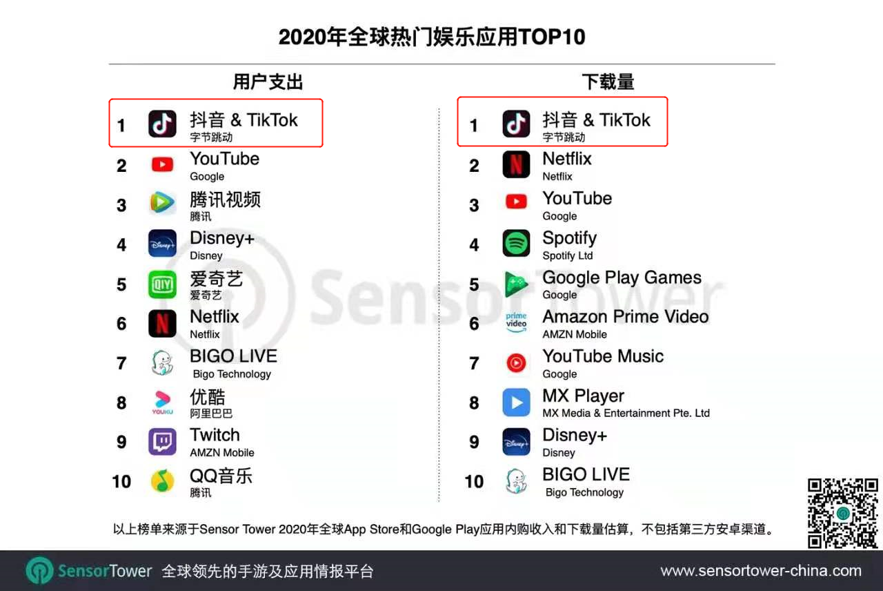 Sensor Tower商店情报平台数据显示,截至2020年12月15日,全球用户支出排名前十的娱乐应用在App Store和Google Play的总收入达到58.2亿美元,同比增长61.8%。下载量排名前十的娱乐应用总共获得24.6亿次下载,较去年同期增长22.5%。