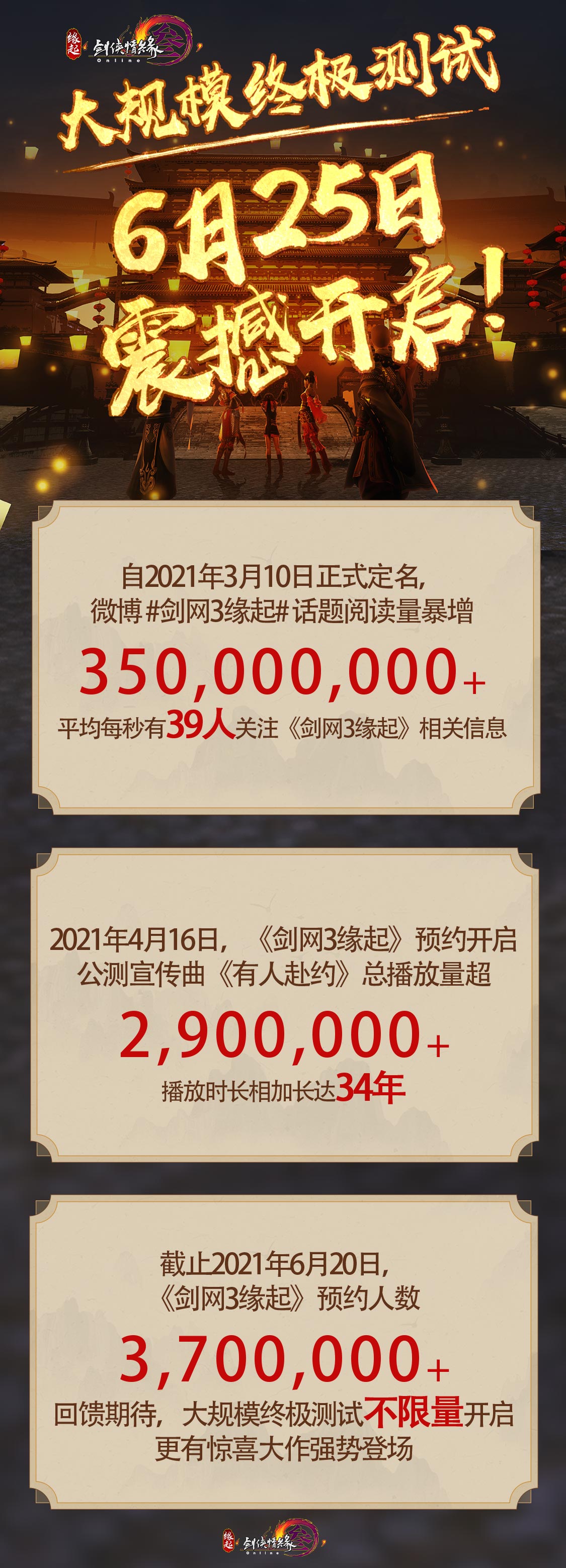《剑网3缘起》自3月10日正式定名,微博#剑网3缘起#话题阅读量暴增3.5亿,截止目前已有370万侠士预约公测,与亲友相聚缘起江湖。与此同时,备受关注的大规模终极测试也将于6月25日震撼开测!与首测相比,本次测试将带来重磅更新,在保证原汁原味的江湖感的同时,更有海量经典玩法加入。阵营日常激情再现,自由燃斗,快意真江湖;美人图、茶馆经典回归,青春重回;挖宝、宠物收集系统更让侠士体验轻松多样的惬意大唐;武学技能原汁原味、镇派经脉多元构建、经典玩法精华集聚......《剑网3缘起》在70级版本的基础上打造更硬核更自由的平行时空,带来最极致的武侠体验!