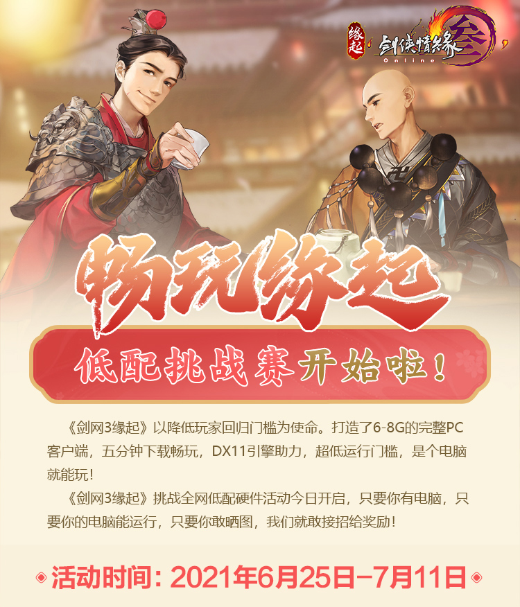 DX11引擎助力,6-8G超轻客户端,超低运行门槛,是个电脑就能玩!《剑网3缘起》“低配挑战赛”今日开启,快晒出你的低配设备运行《剑网3缘起》的图片!配置够低,运行够流畅,大胆晒图,就有机会赢5000元现金、索泰3060显卡等超多奖励!