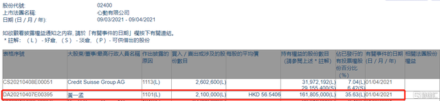 2021年4月1日,心动公司获得黄一孟以每股均价56.5406港元增持210万股,涉资约1.19亿港元。