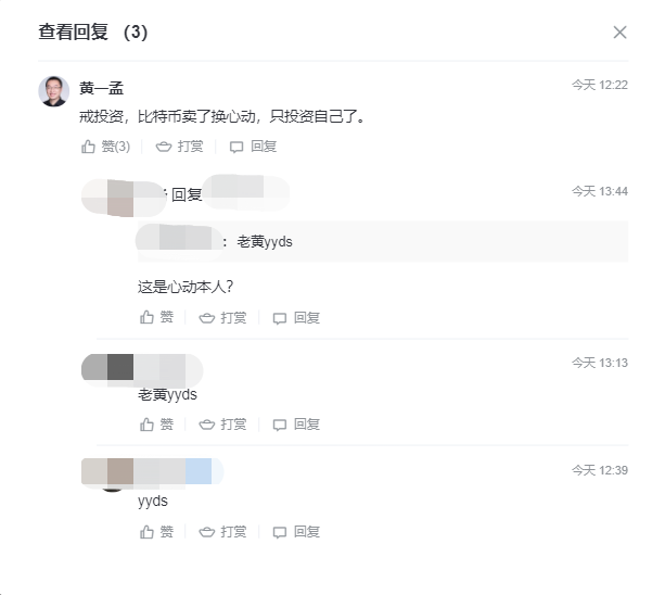 黄一孟本人则在原贴下回复:“戒投资,比特币卖了换心动,只投资自己了。”这条回复下面还有几名用户大呼:“yyds”,场面一度十分喜感。