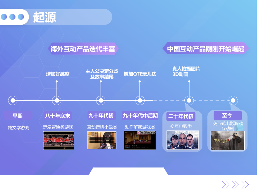 交互式电影游戏这个产品类别来源于海外早期的纯文字类游戏。随后在80年代出现了恋爱冒险型游戏,增加了好感度,90年代初的互动音响小说,增加了很多分支剧情,90年代的动作解谜的游戏,不断叠加了游戏玩法,20年代初海外有非常优秀的CG类交互式电影游戏产生。而国内,近两年出现了《隐形守护者》,探索了交互式电影游戏品类的全新方向-真人交互影游。