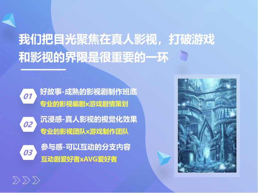 那么如何快速低成本地切入市场,获得产品的最佳打开方式呢?总结几点:一是专业的游戏策划与专业的影视编剧,进行同步的创作开发,这会让影视剧情和游戏剧情好故事的点结合在一起。二是专业的拍摄团队与游戏制作,通过视觉传达、交互反馈等,给玩家带来更深度的沉浸感。三是专业的互动游戏爱好者与AVG游戏爱好者,在故事的基础上,用分支设计等,增加互动的参与感。
