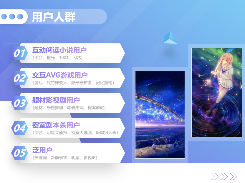 交互式影游的目标人群不仅有游戏用户,其实还包含像互动小说用户、影视用户,甚至现在非常火的剧本杀用户,以及泛用户,年轻人很喜欢新兴、易懂、易上手的玩法。