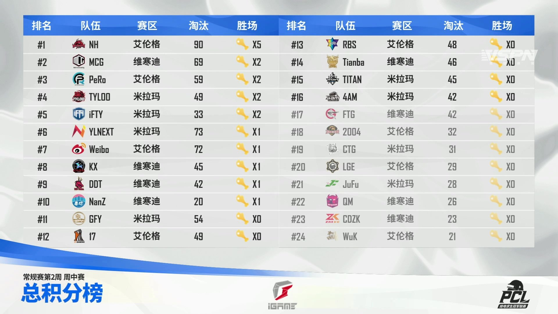 继上周获得周中赛头名之后,NH战队本周状态依旧火热,在首日最后四局比赛连吃4鸡,刷新了PCL连续吃鸡场数的记录。周中赛第二日,NH战队再下一城,最终凭借5鸡90个淘汰的绝对优势昂首挺进周决赛。MCG、PeRo、TYLOO、iFTY四支战队均以2鸡的成绩紧随其后,携手进入周决。由于本周有多支战队收获2局或以上的胜利,因此有6支战队虽未吃鸡,但仍凭借淘汰数优势拿到了周决赛门票,4AM战队以场均伤害量的优势挤掉FTG战队获得最后一个晋级名额。如此一来,本周的周决赛强手云集,精彩大战一触即发。