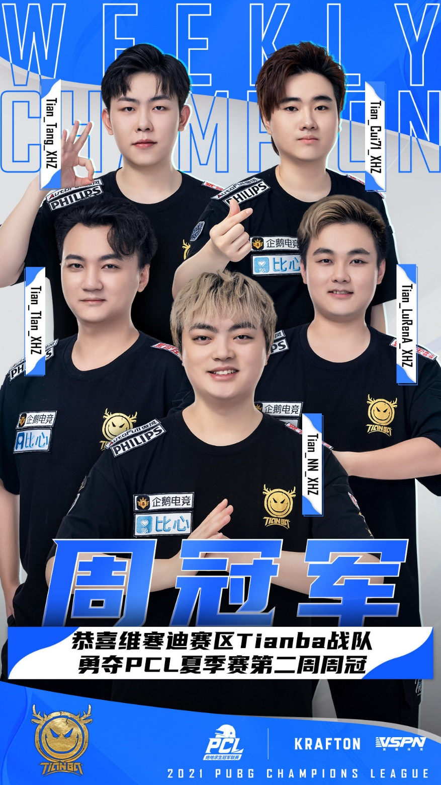 Tianba战队在周中赛表现一般,仅以第14名的成绩进入周决赛。但Tianba战队及时调整状态,周决赛首日前三场均挺进决赛圈,并在第三场成功吃鸡。第二日,Tianba战队势如破竹,从第二局开始连吃三鸡,最终以4鸡83淘汰的巨大优势问鼎第二周周冠军。本周过后,Tianba战队的总奖金来到70000人民币,基本锁定季后赛的一席之地。