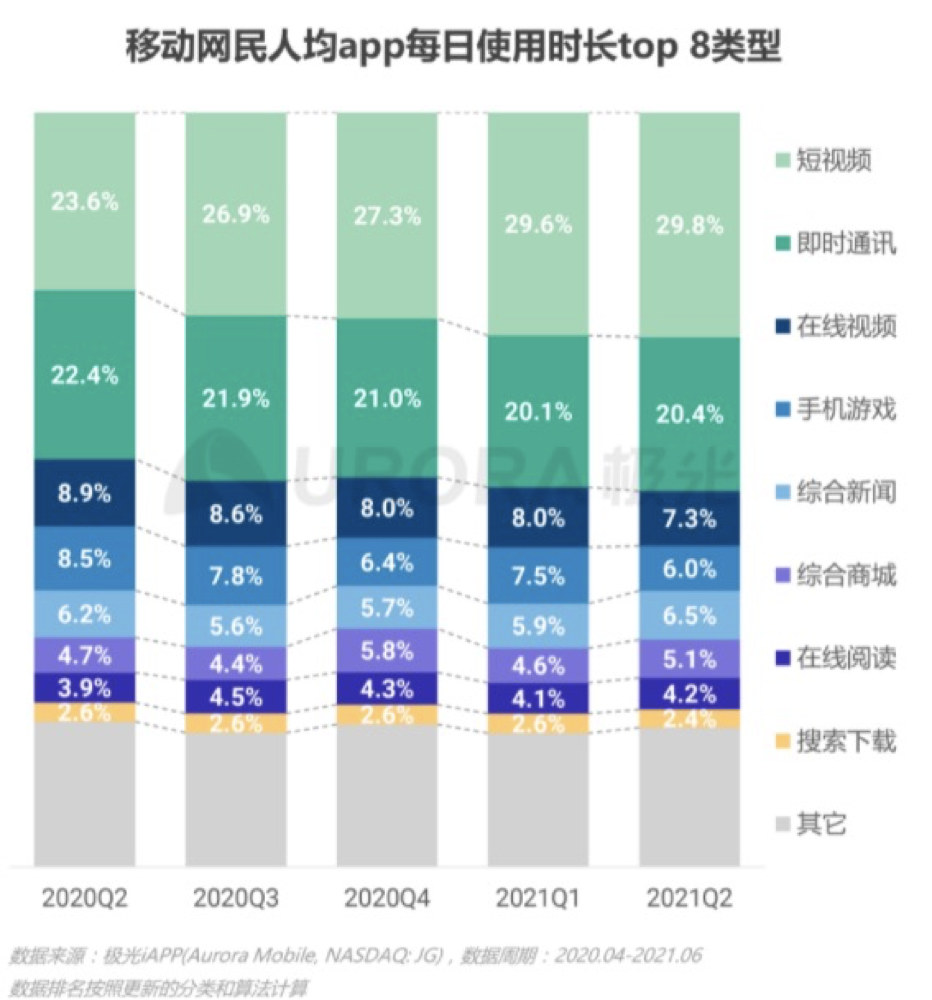 在往细微中谈,极光大数据发布的《2021年Q2移动互联网——行业数据研究报告》显示,2021年第二季度,内地移动网民为11.64亿,每日人均app使用时长5.1小时,其中短视频占了29.8%,即时通讯占了20.4%,在线视频7.3%,手机游戏只占6%。