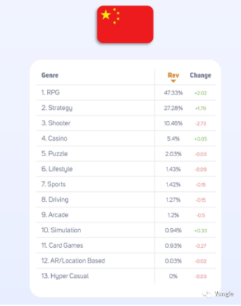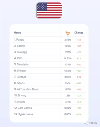 从类型来说,在美国,策略游戏正在开拓阵地,几乎与解谜、博彩游戏不相上下,但在日本,体育游戏仍占据更多的市场份额。与第一季度相比,中国市场第二季度的趋势有所逆转,主要游戏类型中的角色扮演游戏(RPG)和策略游戏赢回了部分失去的市场份额,而射击游戏的市场份额有所下降。