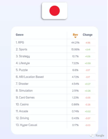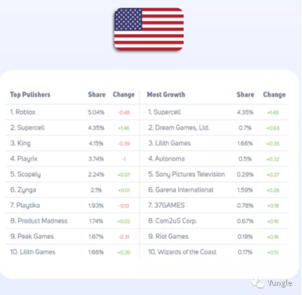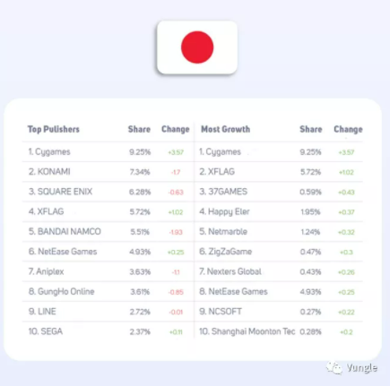 由于《部落冲突》和《部落冲突:皇室战争》表现出色,超级细胞迎来了时隔一段时间后风头最劲的一季,其市场份额超过了King游戏公司。体育类游戏在日本的发展主要归功于Cygames,其开发的游戏《马娘》依旧霸榜,占据了日本9%的市场份额。