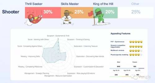 射击游戏主要吸引的玩家类型会喜欢快节奏动作和基于技巧的竞争性玩法。25-44岁的男性是这类游戏的主要用户。