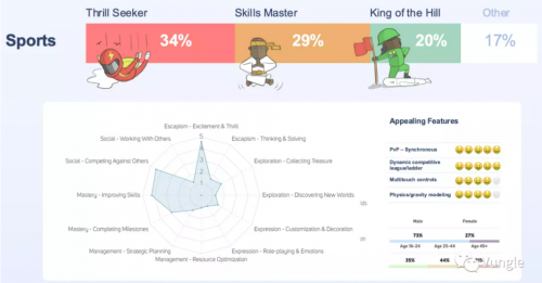 与射击游戏类似,体育游戏最吸引的玩家类型也喜欢刺激、基于技巧的竞争性玩法,但这类玩家还更关注需要快速反应和能提供刺激的玩法。25-44岁的男性是这类游戏的主要用户。