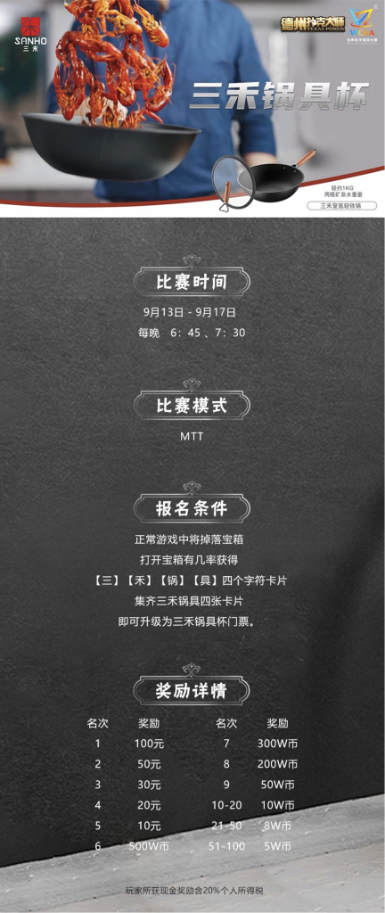注:比赛期间玩家可在德州扑克大师APP【WCAA】赛事专区-【锦标赛】内找到该比赛,凭三禾锅具杯门票报名参赛。
