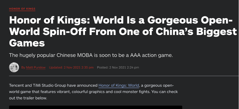 油土鳖上有博主在直播时观看了《王者荣耀·世界》的游戏实录,小岛秀夫也转发了有《王者荣耀·世界》相关消息的推特。不仅如此,重量级游戏行业媒体IGN也报道了此事,发布了标题大意为中国研发了一个大型开放世界游戏的新闻。