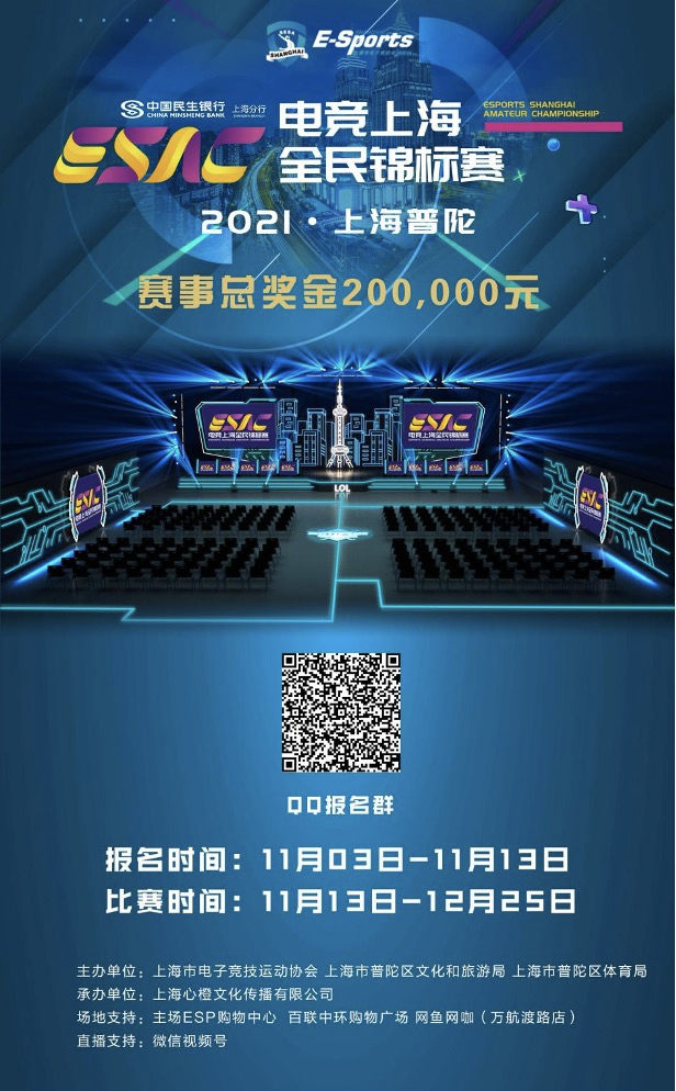 本次活动由上海市电子竞技运动协会、上海市普陀区文化和旅游局、上海市普陀区体育局主办,特别鸣谢ESP购物中心、百联中环购物广场和网鱼网咖(万航渡路店)提供场地支持,微信视频号提供直播支持,英雄联盟授权赛事,以及城市峡谷提供官方赛事服务平台。