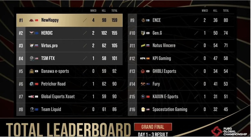 来到最为关键的第三天,NH战队再次迎来爆发。首局虽然没能获得排名分,但凭借勇猛的作战能力拿下8个淘汰。第二局,NH战队抓住机会,趁圈内三队交战之时果断出击收割战场,最后凭借对枪优势战胜DNW战队,以18个淘汰吃下此鸡追平分数。此后两局,NH战队发挥平稳,在最后一局前反超4分,将总冠军的悬念保持到了最后一局比赛!最后一役中,NH战队进圈之路遭遇重重阻碍,中期被HERO战队淘汰,但HERO战队也被两队包夹淘汰。最终,NH战队凭借4鸡98个淘汰159分的出色成绩,将世界冠军这一无上荣光的称号收入囊中,将NewHappy这一名字刻在了绝地大陆的荣耀殿堂!
