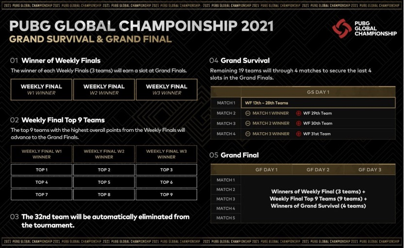 在为期三周的周系列赛结束后,将直接决出12支总决赛的参赛队伍,分别是每一周的周决赛冠军和周决赛总积分榜前9位的战队。而周决赛总积分榜最后一位的战队将被直接淘汰。剩余19支战队将在总决赛的前一天,即12月16日进行总决赛资格赛,选出最后的4个晋级席位。总决赛资格战由4场比赛组成,采用吃鸡赛制,每场比赛的获胜战队将晋级总决赛。其余未能晋级总决赛的队伍将根据其在每周末决赛中的累积积分进行排名。